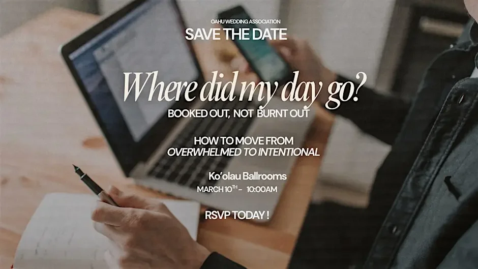 Why do hardworking professionals feel overwhelmed, behind, and exhausted? Join us at our next 60-minute workshop hosted by the Oahu Wedding Association, where Brandi Kiana-Jo (Hawaiʻi Business Coach) will reveal why your schedule isn’t working—and introduce a powerful strategy she created to help leaders reclaim their time, protect their energy, and achieve their goals without burning out or falling off track. Brandi and OWA will help wedding professionals identify why they're overwhelmed and learn a proven time management strategy to reclaim control of their schedules without burnout.